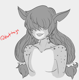 Muted mauve skin and mauve hair, spots/ patterns on skin like a catshark, green eyesThey don't have much 'canon' lore, but she's been in a few 'universes'.